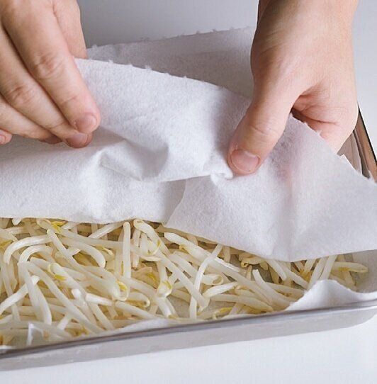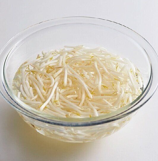 冷水に2分ほどつけて水分を吸わせてシャッキリさせる。長くつけすぎると、もやしの風味が抜けてしまうのでさっと浸すだけでいい。
