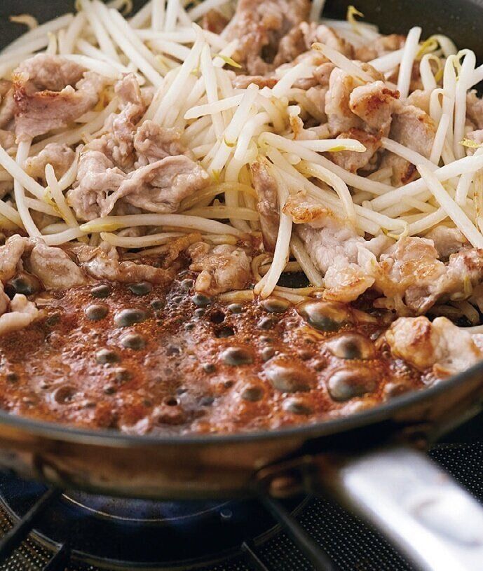 豚肉ともやしを寄せてフライパンの手前のスペースを空け、そこに[A]を入れてよく熱し、煮立ったら手早く炒め合わせる。