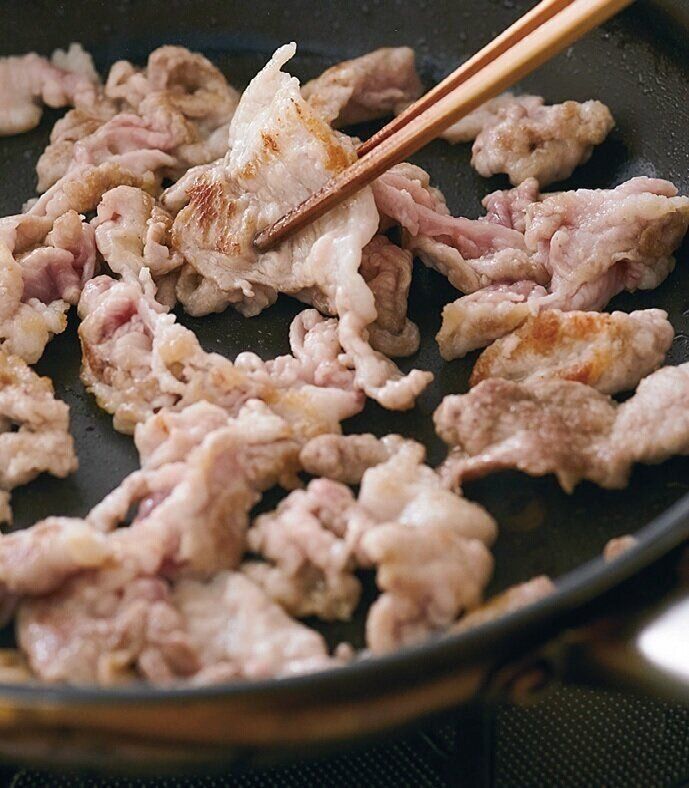 フライパンに油を強めの中火で熱し、豚肉を入れる。フライパンに広げたら1分さわらないで焼き色がつくまで火を通し、返して裏面も同様に1分焼く。
