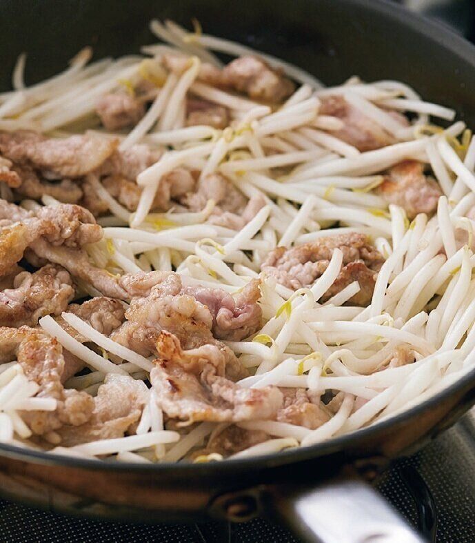 もやしを加えて豚肉と混ぜ、フライパン全体に均一に広げる。広げたら1分30秒、途中で上下を返して両面を焼く。