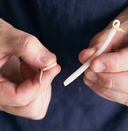 もやしのひげ根を取る。芽の部分は残して細いひげのようにのびている部分を取ると、においが取れて口当たりがよくなる。