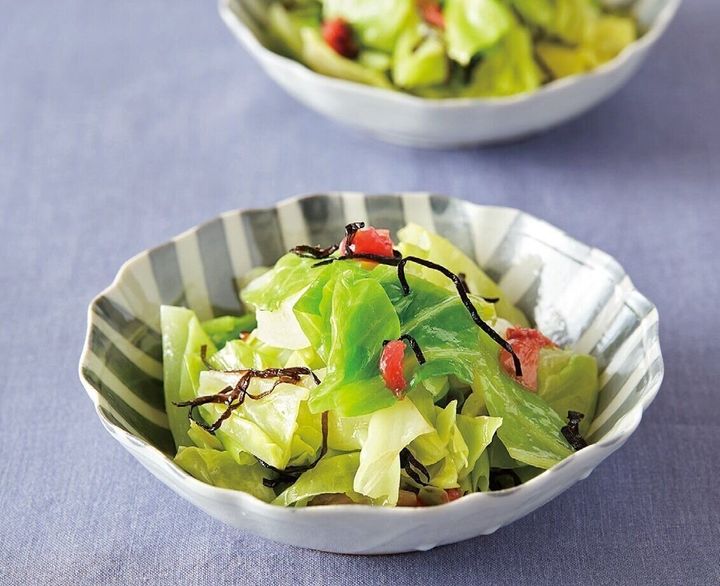 キャベツは一口大に切る。耐熱ボウルに入れてふんわりとラップを掛け、電子レンジで約4分加熱する。粗熱を取って軽く絞るようにして余分な水けをきる。塩昆布、梅干し、ごま油とあえる。