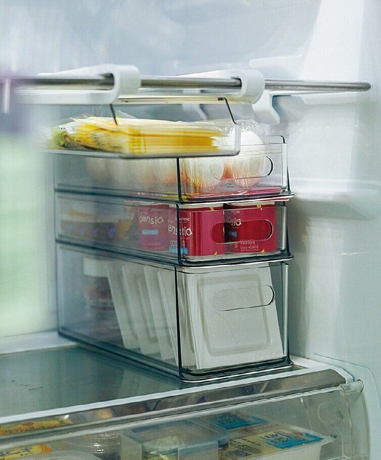 冷蔵室の奥まで収納できて、取り出しやすい。ラックを重ねてトレーを入れれば引き出し式になり、冷蔵室がすっきり!