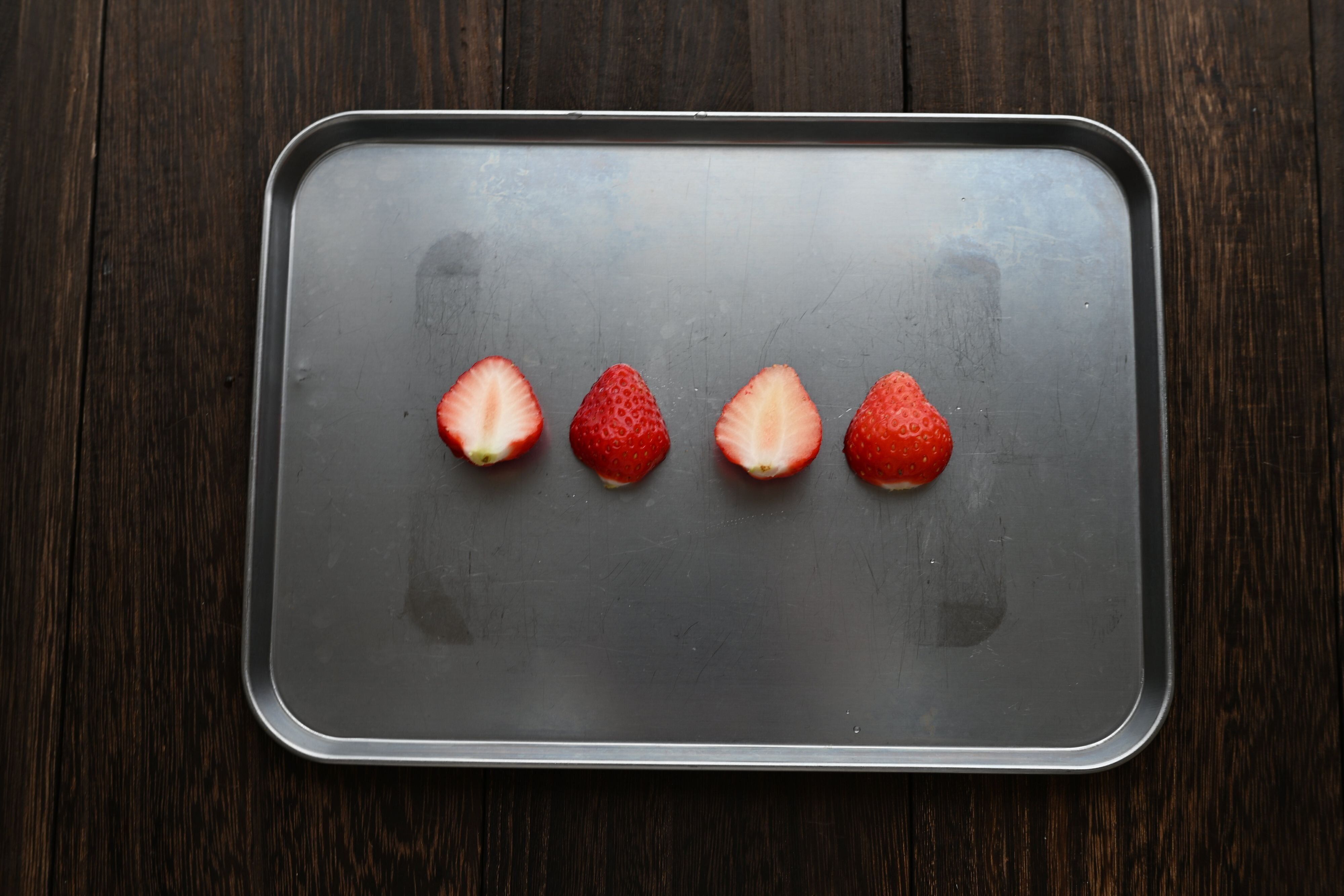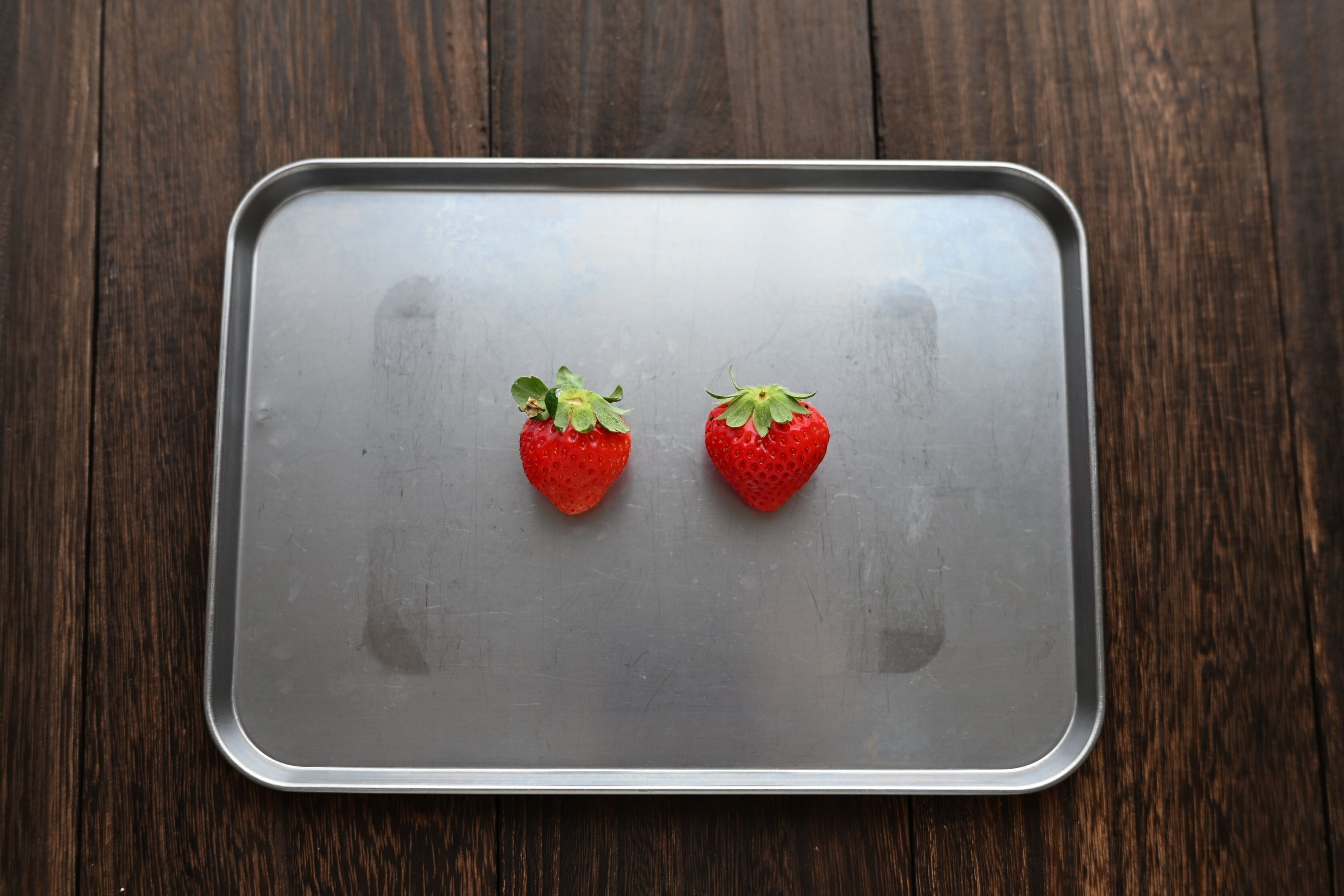 まず、つぶつぶが真っ赤ないちごと、少しつぶつぶの色素の薄いいちごを準備。見た目はどちらも実がしっかりしていて艶もあり傷んでいる個所もありません。ほぼ同じに見えるいちごですが、違うのは粒の色だけ。
