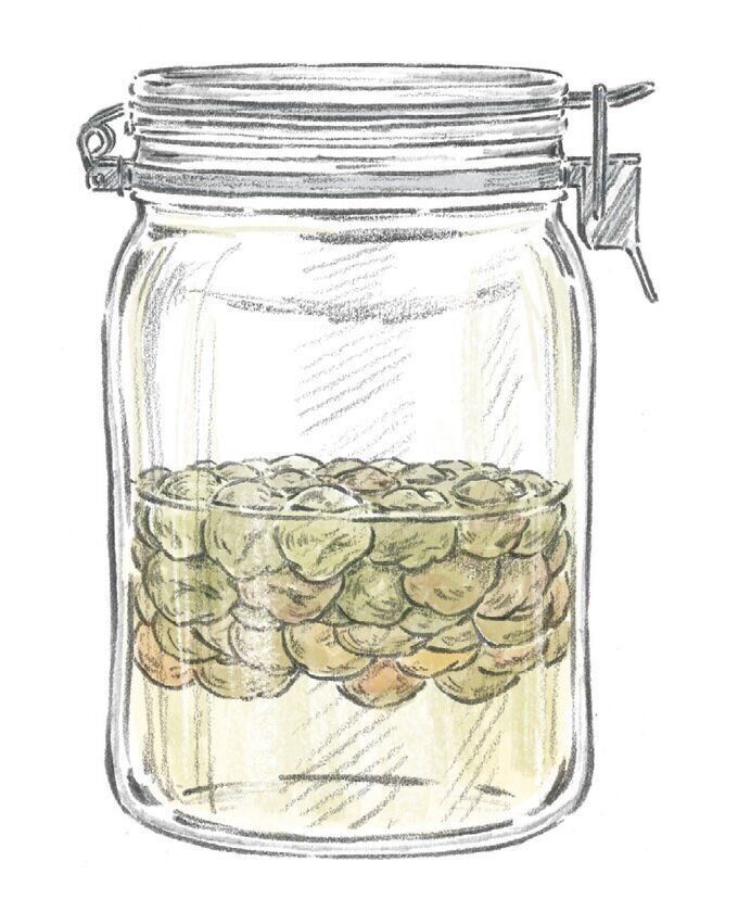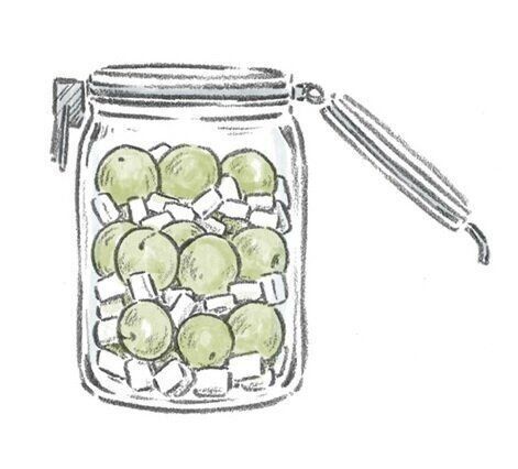 (2)消毒した保存瓶に梅と氷砂糖を3回くらいに分けて交互に入れ、酢を回し入れる。