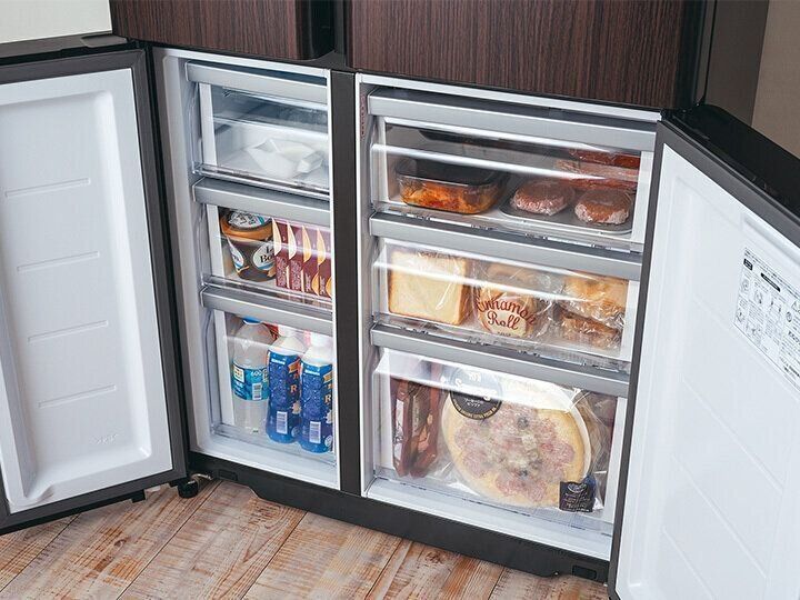 奥行きが635mmと浅いので、キッチンの動線をしっかり確保できるうえ、最上段の奥にも手が届きやすい。2Lのペットボトルが最大6本も入るドアポケットや大容量の冷凍室など、これからの季節はとくに重宝しそう。