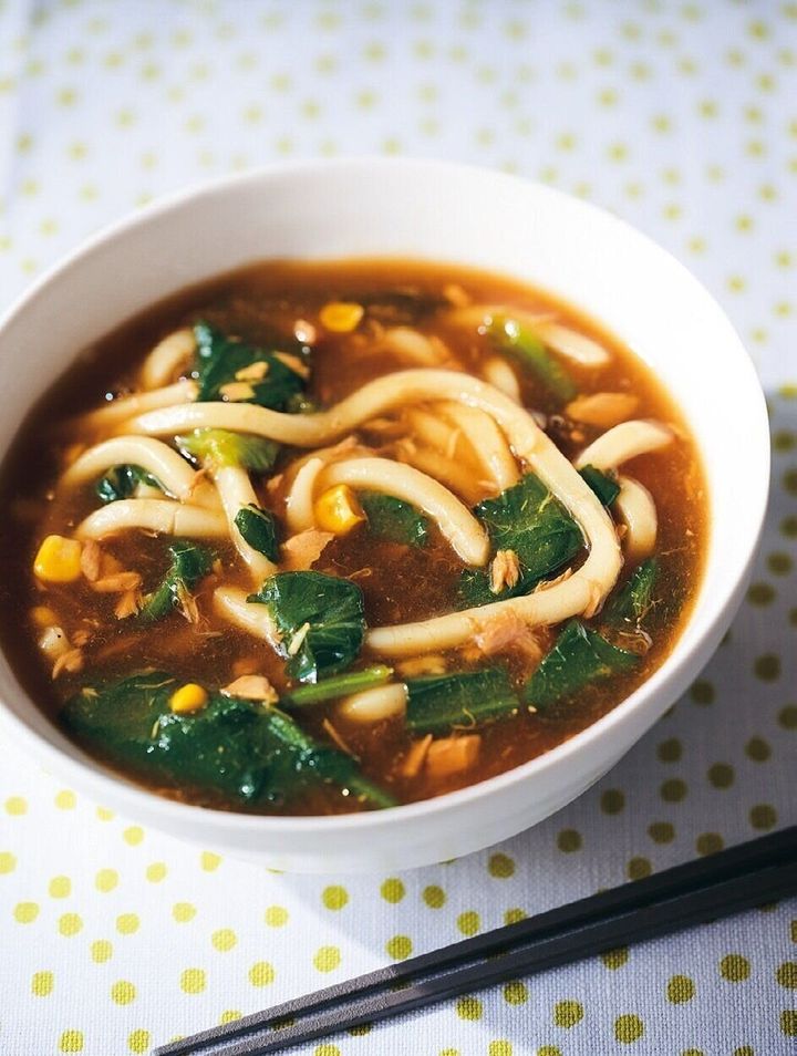 (3)ルウが溶けたら水溶き片栗粉(片栗粉大さじ3を同量の水で溶いたもの)でとろみをつけて再び煮立て、ゆでうどん4玉、冷凍ほうれん草120gを凍ったまま加えて中火で約1分煮る。