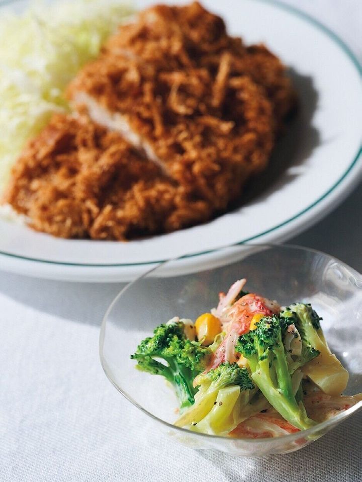 (1)耐熱容器に冷凍ブロッコリー400gを入れてラップをふんわりと掛け、電子レンジで6分加熱し、粗熱を取って水けをきる。かに風味かまぼこ6本は食べやすく裂き、ホールコーン缶1缶(80g)は汁けをきる。