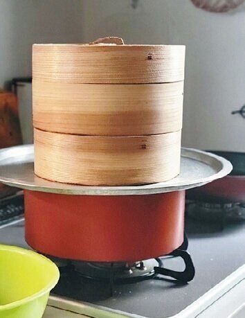 鍋の湯気を蒸し料理にも使って熱気を抑え、一石二鳥!!