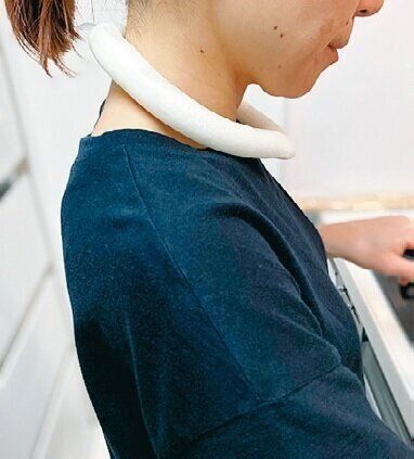 真夏の給食室はものすごい暑さ!仕事中、スタッフ同士で声を掛け合いながらしっかり水分と塩分を補給して乗り切ります。自宅での調理中はネッククーラーや扇風機を活用。