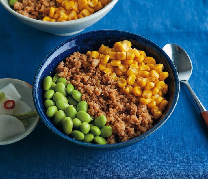 (1)のフライパンを拭き、みそそぼろの材料を入れ、菜箸数本で混ぜる。ひき肉に調味料がなじんだら強めの中火にかけ、ポロポロになり、汁けがとぶまで炒める。ご飯にのせ、(1)、枝豆をのせる。