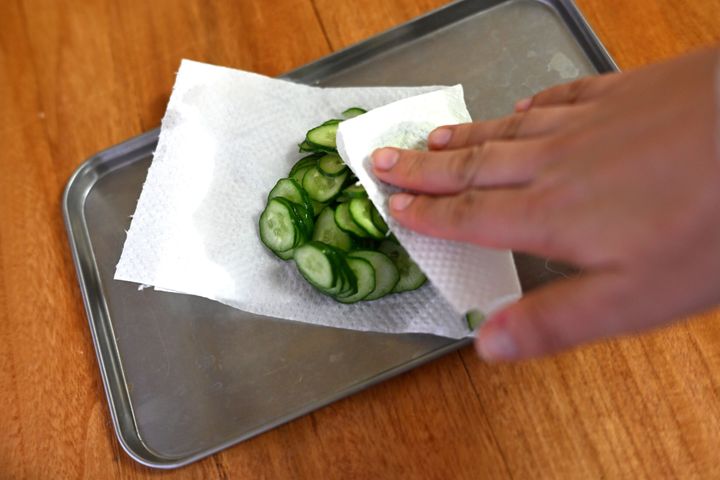 まずは、きゅうりスライス。スライスしたきゅうりに軽く塩をかけて5分置きます。その後、きゅうりを軽く絞ると水分が出るので、その水分をキッチンペーパーで取り除きました。