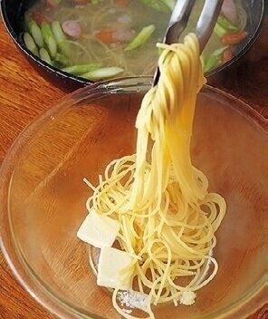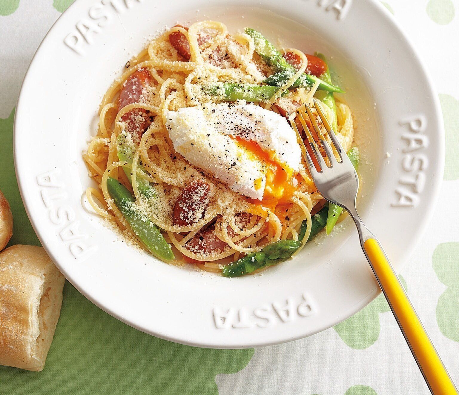 フライパンに湯2Lを沸かして塩を入れ、パスタを表示どおりにゆで始める。ゆで上がり時間の1分前にソーセージ、アスパラを加えて一緒にゆで、[A]のボウルに入れて混ぜる。