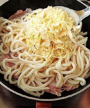 ボウルに[A]を入れて混ぜ、キャベツを加え、箸でさっくり混ぜて生地を作る。フライパンに油を中火で熱し、豚肉を全体に広げる。うどんをほぐしてのせ、生地を広げてのせ、強めの中火で4~5分、豚肉にこんがりと焼き色がつくまで焼く。