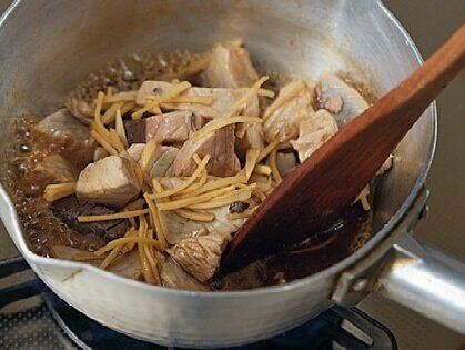 (2)鍋に[A]を入れて混ぜ、強めの中火にかける。ひと煮立ちしたらかつお、しょうがを加え、時々混ぜながら約3分煮る。粗熱を取ってざるに上げ、煮汁に水を加えて450mlにする。