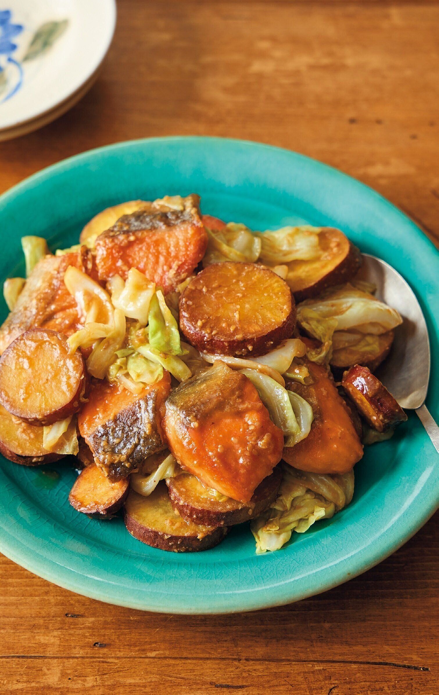 (1)のフライパンを拭いて油大さじ1を熱し、さつまいもを入れてふたをして、弱めの中火で2~3分焼く。焼き色がついたら返し、同様に焼く。キャベツを加え、さらにふたをしてときどき返しながら約2分蒸し炒めにする。