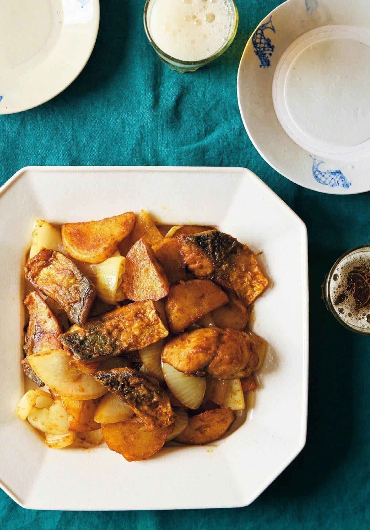 (1)のフライパンを拭いて油大さじ1を熱してじゃがいもを並べ、弱めの中火でふたをして約3分焼く。色づいたら返し、中まで火が通って表面がカリッとするまでさらに約3分炒める。じゃがいもが柔らかくなったら玉ねぎを加え、約3分炒める。