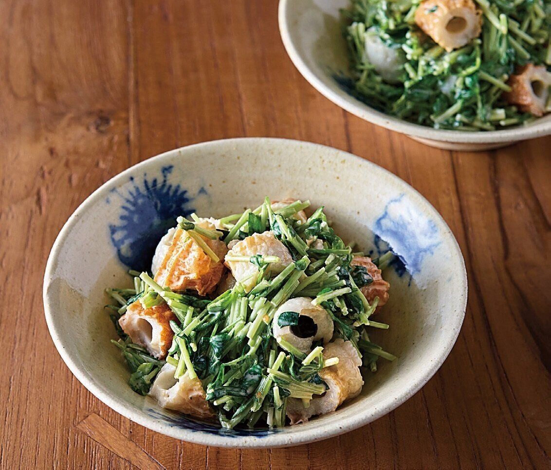 ちくわは小さめの一口大に手でちぎる。豆苗は長さ2cmに切る。ボウルに[A]を混ぜ、豆苗を加えて全体にからむまでよくあえる。ちくわを加え、さっとあえる。