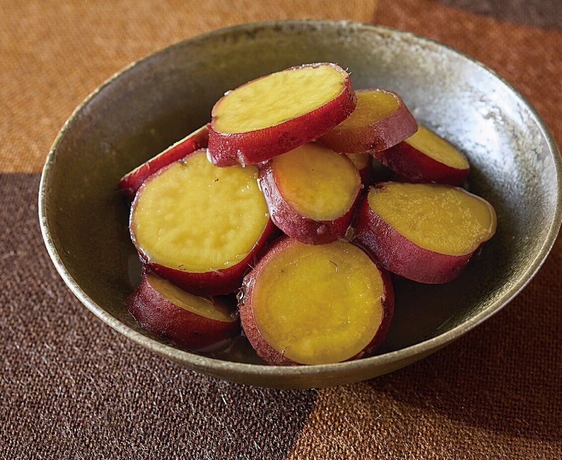 さつまいもは皮つきのまま厚さ1cmの輪切りにし、さっと水にさらして水けをきる。鍋に[A]を混ぜ、さつまいもを入れて強火にかけ、煮立ったらふたをして弱火で約15分煮る。ざっくりと混ぜ、さましながら味を含ませる。食べる際にもう一度温める。