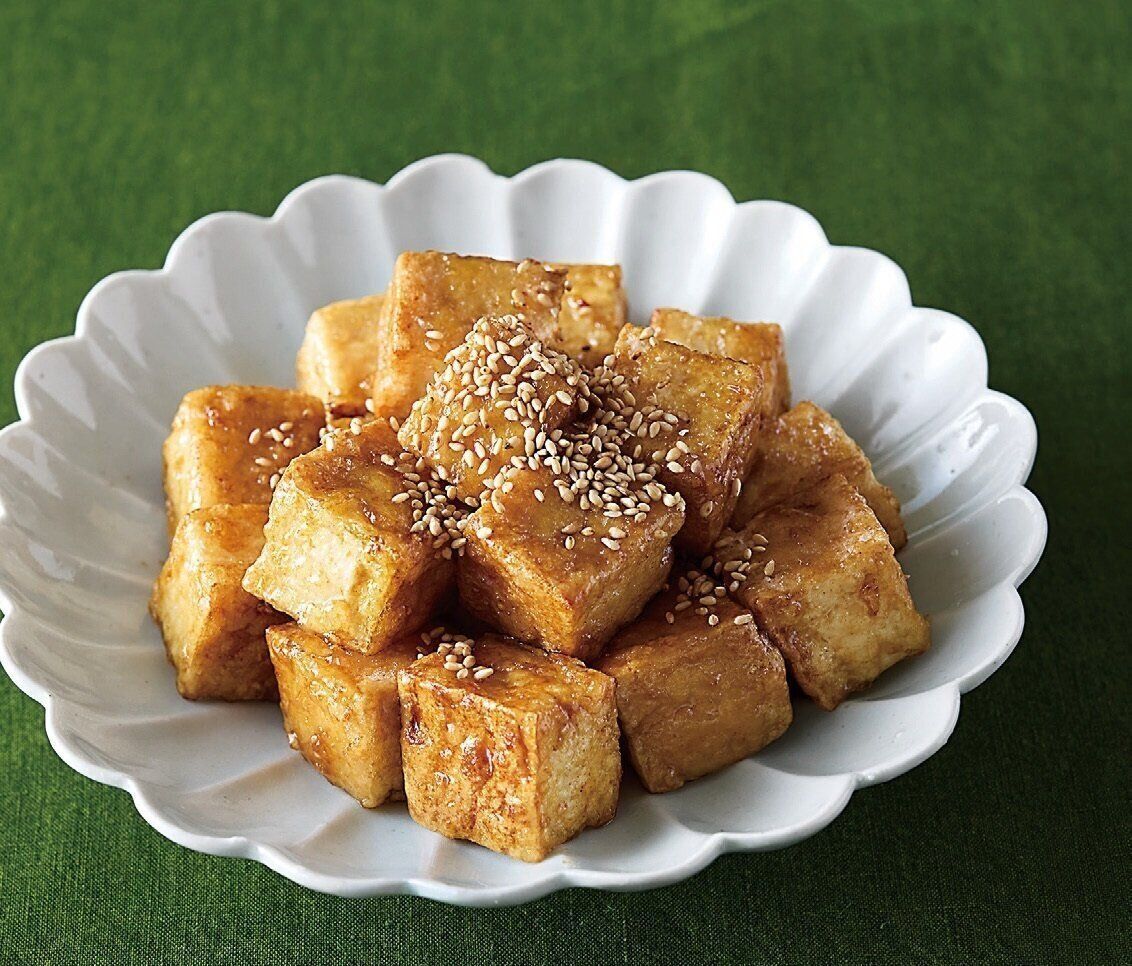 厚揚げはペーパータオルで油を押さえ、1枚を12等分に切って片栗粉を薄くまぶす。フライパンに油を中火で熱し、厚揚げを入れ、ときどき返しながら3~4分焼く。フライパンの余分な油をペーパータオルで拭き、[A]を加えてさっと炒める。器に盛り、ごまをふる。