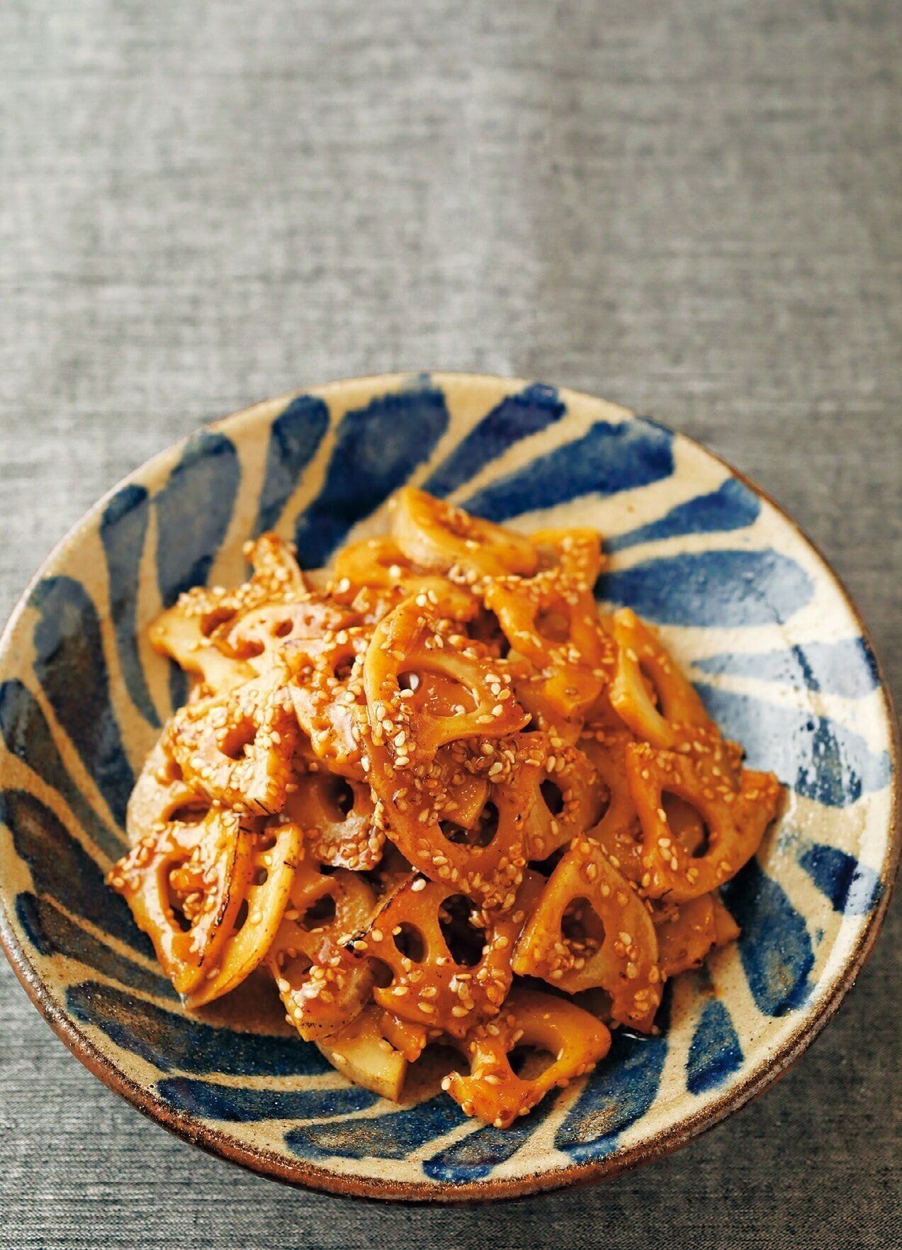 フライパンにごま油小さじ1を強めの中火で30秒熱し、幅1cmのいちょう切りにしたれんこん300gを入れて焼く。火が通ったら火を弱め、焼き肉のたれ大さじ2、めんつゆ(2倍濃縮)大さじ1を加え、好みの濃さになるまで煮つめてからめる。