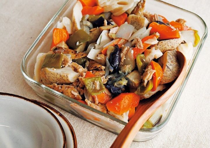 半端野菜合計500gくらい(写真は、玉ねぎ1/2個、ピーマン2個、なす1個、にんじん1本、ごぼう1本、れんこん200g)は食べやすい大きさに切る。フライパンに野菜を入れ、ツナ缶1缶(汁ごと)、白だし大さじ2~3、好みでおろしにんにく(チューブ)2cmを加える。中火で熱して全体をよく混ぜ、ふたをして10分煮る。味がたりなければ、塩少々を加える。