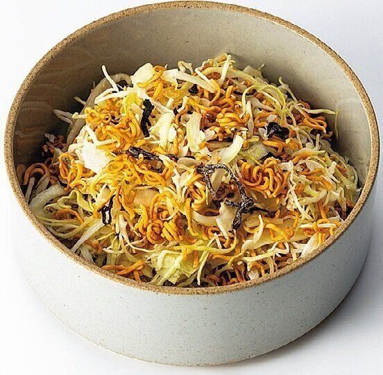 チキン味のミニラーメンは、調味料代わりにもなります。砕いて炒飯の具にしたり、キャベツと塩昆布、ごま油と一緒に混ぜてサラダにしても絶品。
