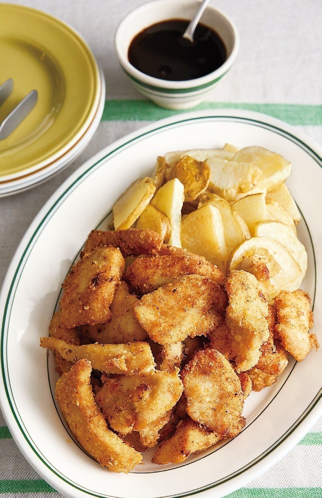 じゃがいもを揚げたあとの油に(2)の鶏肉を入れ、強めの中火で約3分さわらずに揚げる。ころもが硬くなってきたら裏返し、全体に色がつくまでときどき返しながら3~4分揚げ、油をきる。器に盛り、じゃがいもとウスターソースを添える。