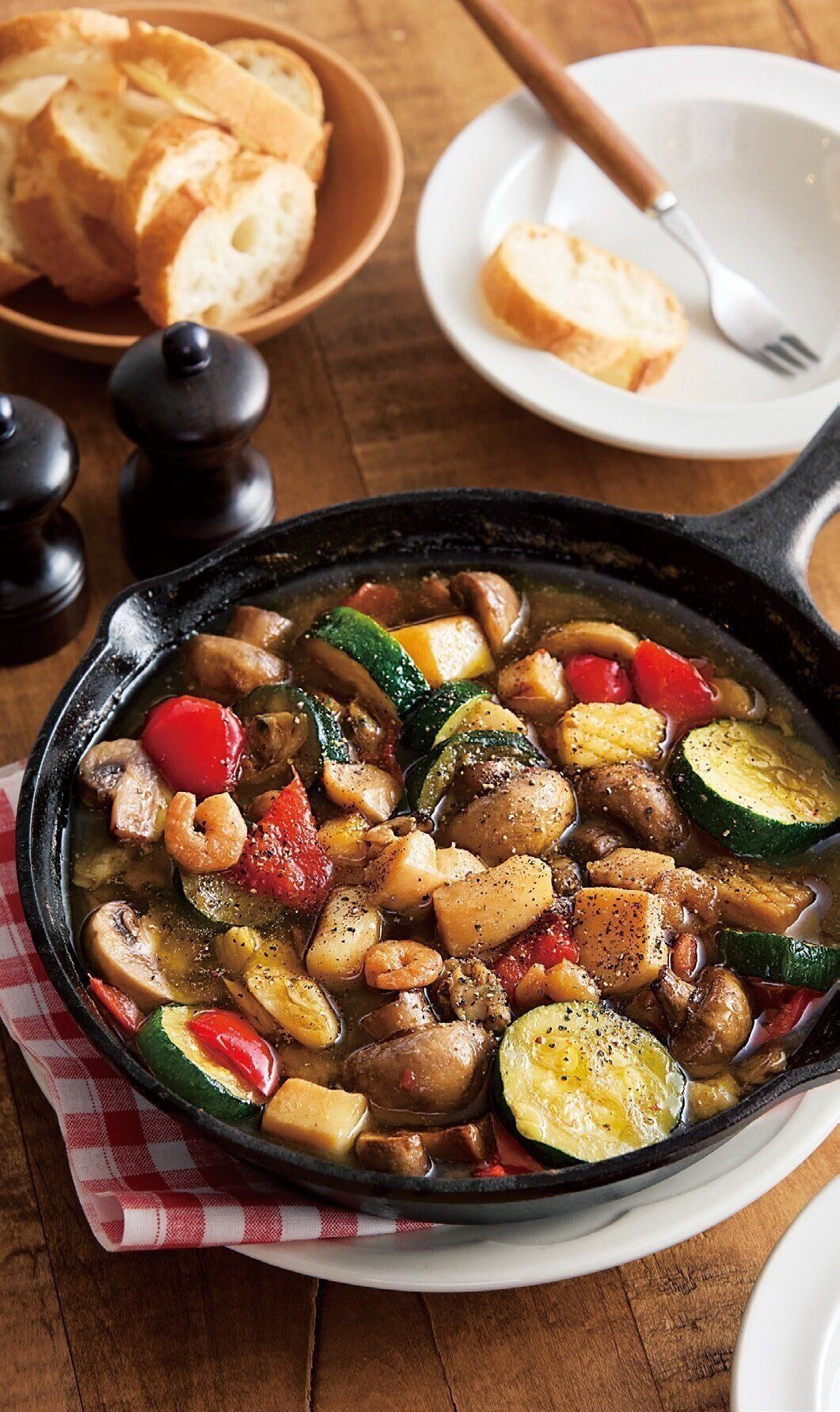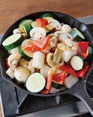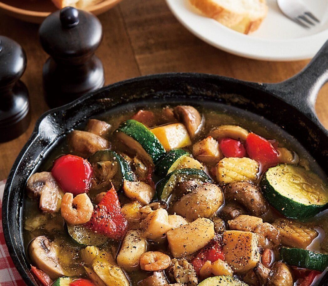 直径22~24cmのスキレットまたはフライパンにオリーブ油、にんにく、しょうゆ、マッシュルーム、ズッキーニ、パプリカ、シーフード(冷凍のまま)を入れ、強めの中火にかける。シーフードと野菜に火が通るまで約8分、ときどき混ぜながら加熱する。火を止め、黒こしょうをふる。