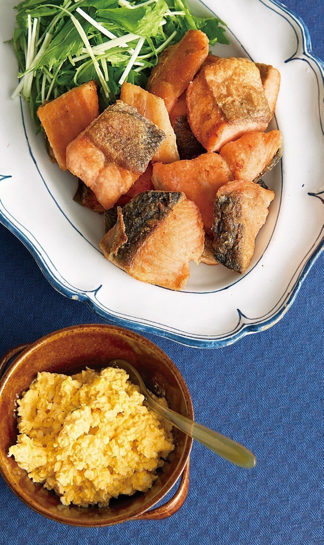 鮭は1切れを3等分に切って水けを拭く。(1)のフライパンをさっと洗って鮭を入れ、[A]の塩をふって薄力粉をまぶす。油大さじ2を回し入れて強めの中火にかけ、両面に香ばしい焼き色がつくまでときどき返しながら焼く。