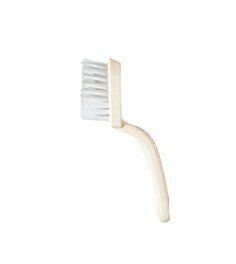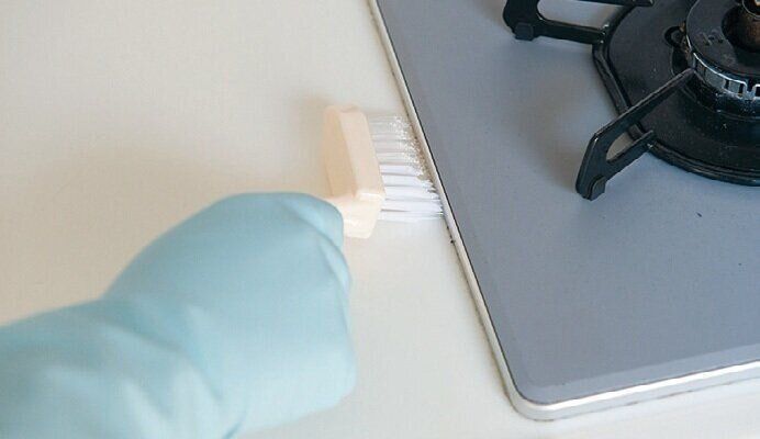 縁に隙間のあるコンロの場合は、ここに汚れがたまりがち。アルカリ電解水をスプレーしながら、Vカットブラシか古歯ブラシで細かいゴミをかき出す。