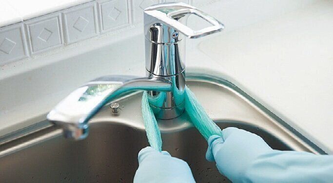 蛇口にクエン酸水をかけてナイロンタオルで磨く。ナイロンタオルは長さを半分くらいにカットすると力を入れやすくなる。お湯で流して、仕上げにふきんで空拭きする。