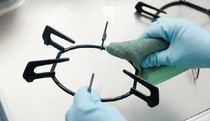 ステンレススポンジ(ステンレスたわしより五徳に密着するスポンジの方が汚れがラクに落ちる)に重曹(または油汚れ用洗剤)を付けて五徳をこすり、お湯で洗い流す。