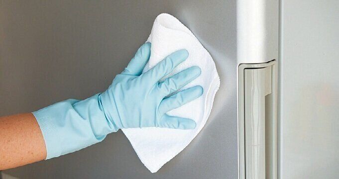 外側をマイクロファイバークロスでお湯拭きする。上部の天板部分など、汚れのひどい所は、アルカリ電解水をスプレーしたウエスで拭く。