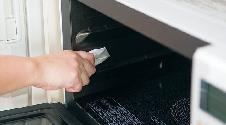マイクロファイバークロスで庫内と外側をお湯拭きする。庫内にこびり付いた汚れがゆるんだところで、ウエスでくるんだへらか端が平らな割り箸でこそげ落とす。
