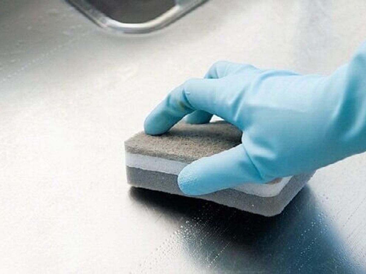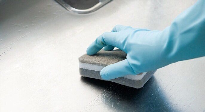 食器用スポンジにクリームクレンザーを含ませてシンクを磨く。ステンレスの場合、丸く磨くと跡が残るので、ステンレスの目に沿って磨くときれいに仕上がる。