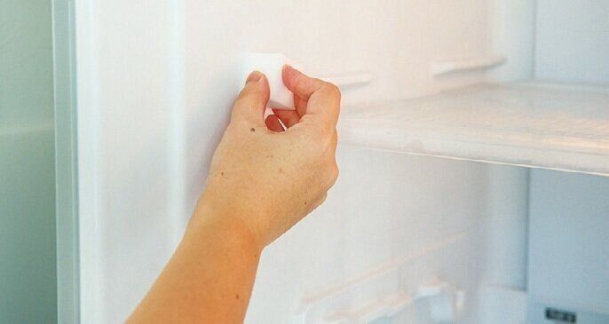 食品を入れるので、できれば洗剤なしですませたい場所。外せるパーツはお湯で洗って、から拭きを。庫内はお湯でぬらしたメラミンスポンジで磨く。