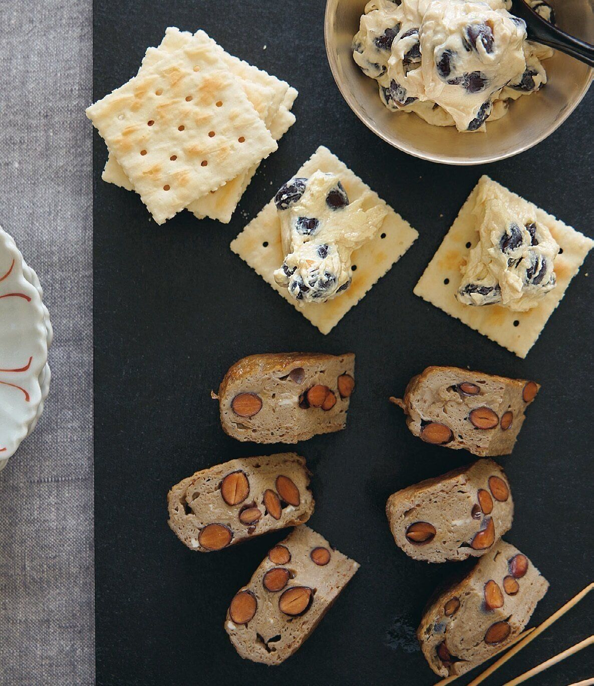 クリームチーズを練り混ぜ、汁けをきった黒豆を加えて混ぜ、クラッカーにのせる。