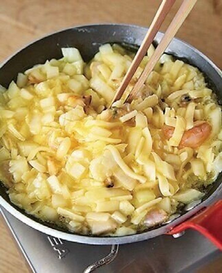 シーフードミックスはざるに入れ、流水で洗い、水けを拭く。玉ねぎは1cm四方に切る。