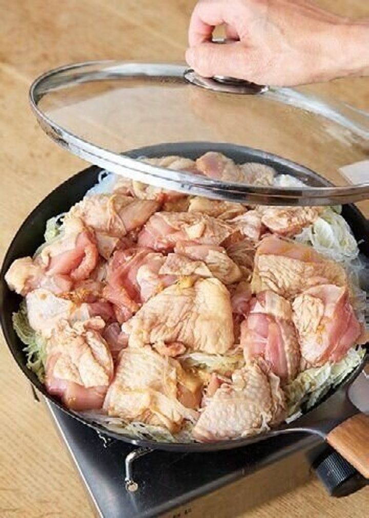 【ワタナベさん】これはフライパンに入れて火にかければできるフライパン重ね蒸しです。いちばん上にしょうゆやおろししょうがをもみ込んだ鶏肉をのせて蒸すから全体に調味料がしみます。今日はしょうゆ味にしましたが、みそをもみ込んで作ればみそ味になります。重ね蒸しは、疲れていても作りやすいおすすめの調理法です。