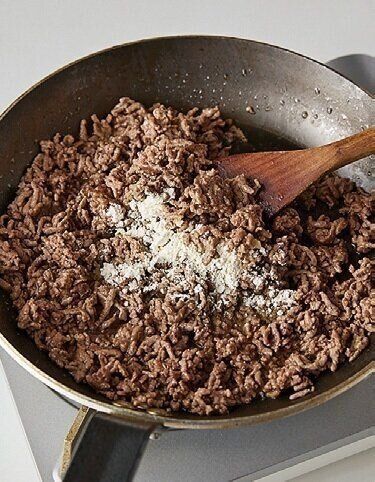 フライパンに油大さじ1/2をたして中火で熱し、ひき肉を入れ、ほぐしながら炒める。肉の色が変わったら薄力粉を加え、粉っぽさがなくなるまで炒める。パプリカを加えてさっと炒める。