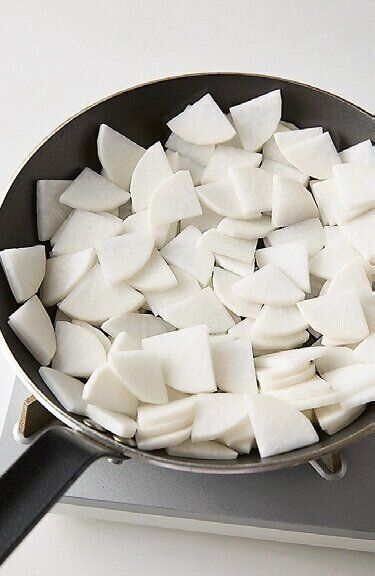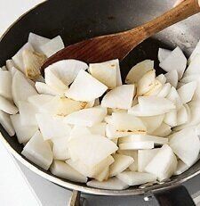 【市瀬さん】大根の炒めものは、フライパンに広げ入れて、初めの3分くらいはさわらずによく焼くことがポイントです。ところどころに焼き色をつけると香ばしさが加わり甘みも出ておいしくなります。また、しんなりするので肉と炒めたときによくなじみます。