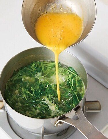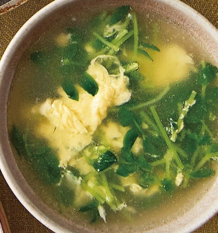 煮立ったら豆苗を加え、中火で約2分煮る。溶き卵を回し入れ、ふわっと浮いたら火を止め、ひと混ぜする。
