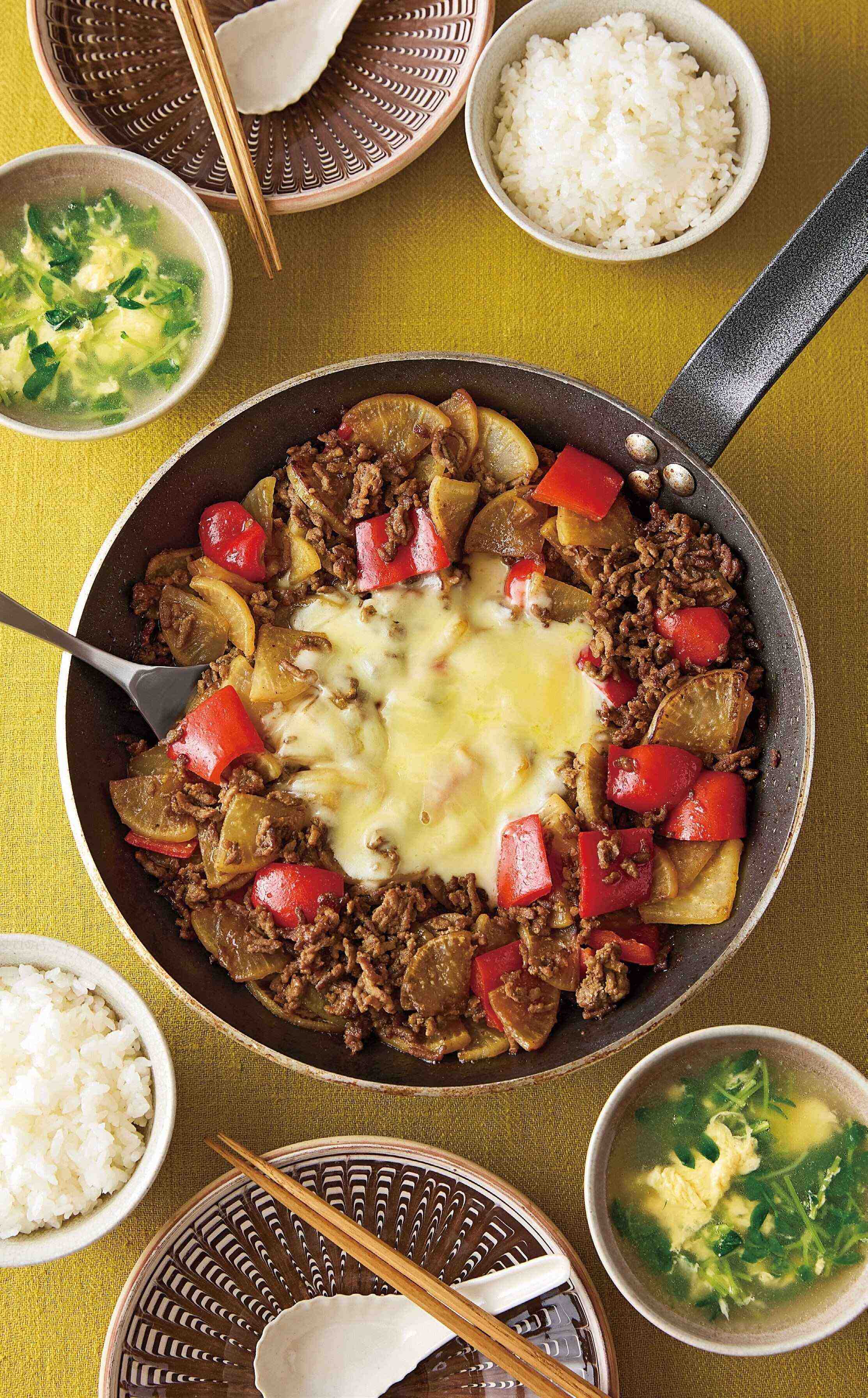 ひき肉と大根のカレーチーズは最強!大根をフライパンに広げ、焼いてから炒めていったん取り出します。その間にスープの鍋を火にかけます。フライパンと鍋に順に材料をたしていけば、20分でスタミナ献立が完成!