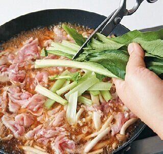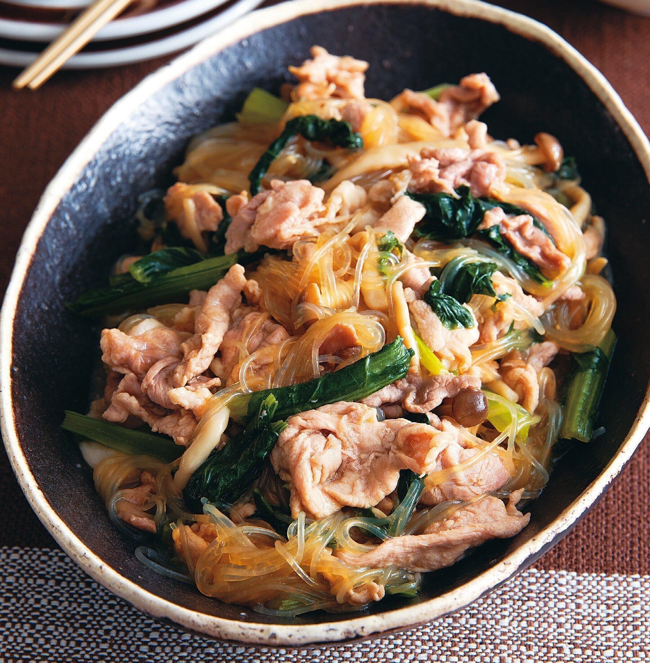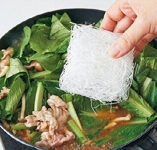(2)(1)の煮汁が煮立ったら(1)の豚肉、しめじ(ほぐしながら)、小松菜(はさみで長さ5cmに切りながら)、春雨(乾燥のまま)を入れ、再び沸騰したら中火で約5分、時々混ぜながら煮る。