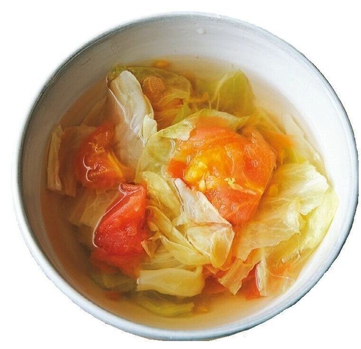 鍋にだし汁、おろししょうが、キャベツ、トマトを入れて中火にかけ、煮立ったら弱火にして約1分煮て、塩を加える。