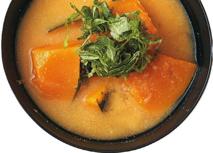 鍋にだし汁、かぼちゃを入れて中火にかけ、煮立ったら弱火にし、ふたをして約6分柔らかくなるまで煮る。みそを溶き入れ、煮立つ直前に火を止める。器に盛り、青じそをのせる。