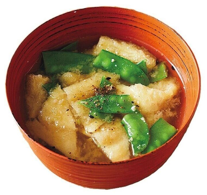 鍋にだし汁を入れて火にかけ、煮立ったらきぬさや、油揚げを加えてさっと煮て、みそを溶く。器に盛り、七味唐辛子をふる。