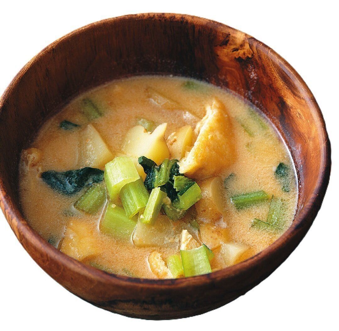 鍋にだし汁、じゃがいもを入れ、中火で7~8分煮て、油揚げ、小松菜の順に加えて煮る。小松菜がしんなりしたら豆乳を加え、煮立つ直前で火を止め、みそを溶く。