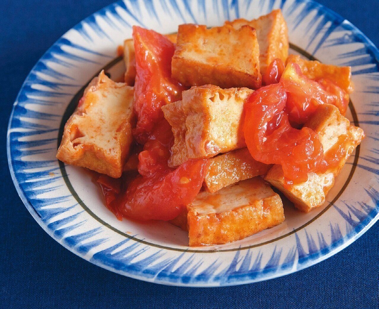 厚揚げは半分の大きさに切ってから端から幅1cmに切る。フライパンに厚揚げ、にんにく、トマトを入れてごま油を回しかけ、強めの中火でトマトがくずれるまで約3分炒める。[A]を加えて煮つめる。(近藤)